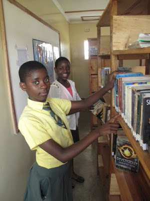 Library Assistants Alinafe and Wezzie keep the fiction section in good order.