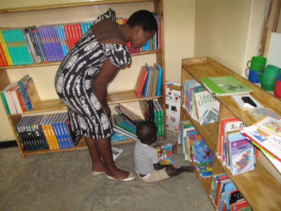 Dinna Mwale assists Tama to find a book in the new Primary Library. The library is located in a storeroom off the main library which also houses a growing Teachers Resource Library.