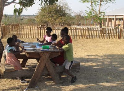 Memory spends some quiet time trying out some new paints with a few of the primary children. The primary school is in the background.